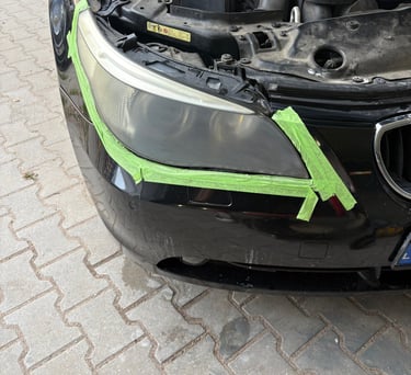 Paruošimas: Kruopščiai nuplauname ir nusausiname žibintus. Aplink esančios kėbulo dalys yra saugiai apklijuojamos, kad būtų apsaugotos nuo pažeidimų.